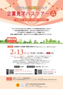 「インターネットだけでは自分にあった会社かわからない」「一度に色々な企業の話を聞いてみたい」そんなあなた向けの企業見学バスツアー・合同企業説明会(マッチングフェア)を開催します。積極採用中の求人や、あなたにぴったりの企業と出会えるチャンスです。